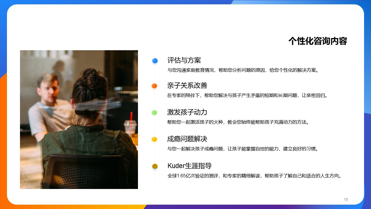 一、解决方案: What we are doing. 课程方案 二、初阶课程 初阶课程 识别爱工作坊 表达爱工作坊 三、高阶课程 高阶课程 旋转门工作坊 四、个性化咨询 个性化咨询 评估和方案 亲子关系改善 激发动力 成瘾问题解决 Kuder生涯指导 五、其他支持 其他支持